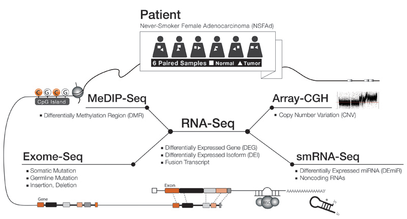 One of the most fertile applications of next generation sequencing technology will be in the field of cancer genomics. Here, we report a high-throughput multi-dimensional sequencing study of primary non-small cell lung adenocarcinoma tumors and adjacent normal tissues of 6 never-smoker Korean female patients. Our data encompass results from exome-seq, RNA-seq, small RNA-seq, and MeDIP-seq. We identified and validated novel genetic aberrations including 47 somatic mutations and 20 fusion transcripts. We also characterized gene expression profiles which we sought to integrate with genomic aberrations and epigenetic regulations into functional networks. Importantly, several gene network modules relevant to carcinogenesis including G2/M cell cycle checkpoint emerged as the primary sources of disturbance in these patients. In addition, the data strongly suggest that microRNAs make key regulatory inputs into these modules. Our study offers a paradigm for integrative genomics analysis and proposes potential target pathways for the control of non-small cell lung adenocarcinoma.
