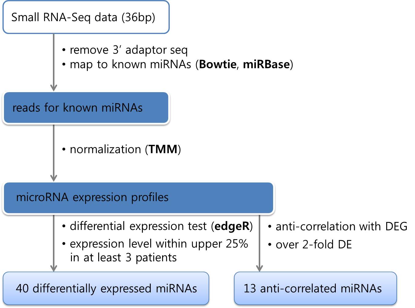 The workflow for analyzing small RNA-Seq data is shown in Supplementary Fig. 4. In this study we focused on microRNA exclusively even though our raw sequencing data included other types of small RNAs as well. Our analysis consists of four parts - mapping, normalization and quantification, identification of differentially expressed microRNAs (DEmiRs), and identification of microRNAs anti-correlated with DEGs. Sequence reads were mapped with Bowtie V.0.12.7 with the perfect match option onto the known microRNA database (miRBase release 17) after removing adaptor sequence (5'ATCTCGTATGCCGTCTTCTGCTTG).