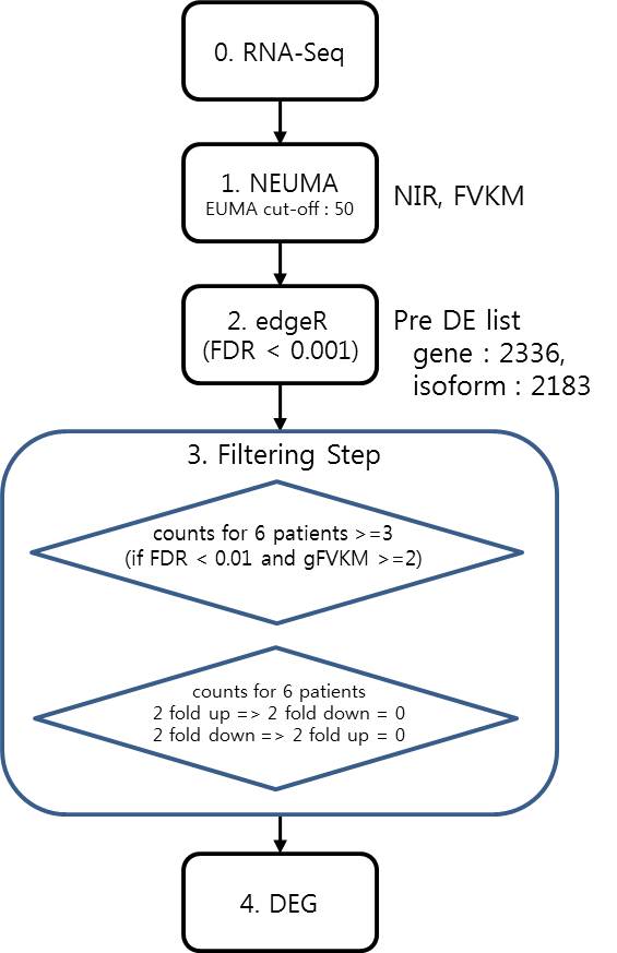 We used the NEUMA program for quantifying transcript abundance. Since NEUMA maps sequence reads to the established transcriptome, identification of novel isoforms is not supported. However, its major merit is the accuracy of quantification as its algorithm mimics the process of real time PCR (agreement ratio over 0.9 with the experimental data).