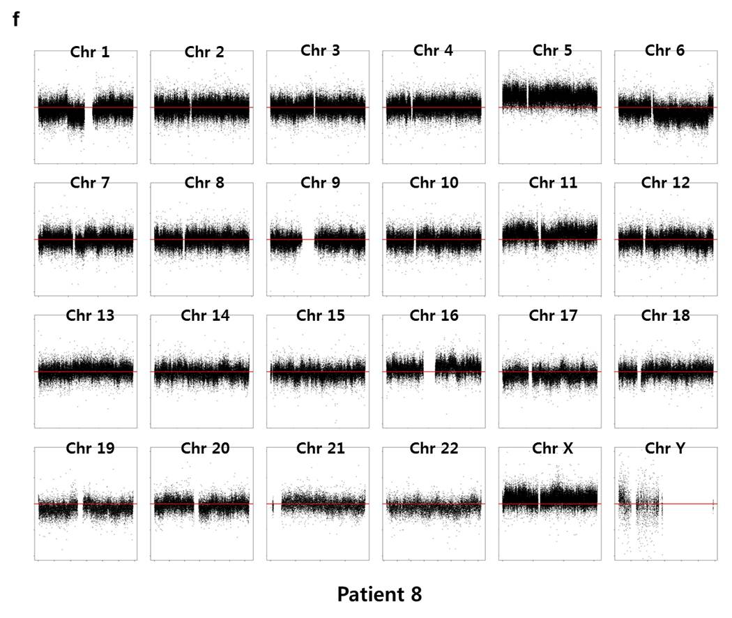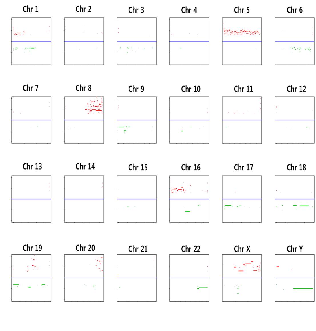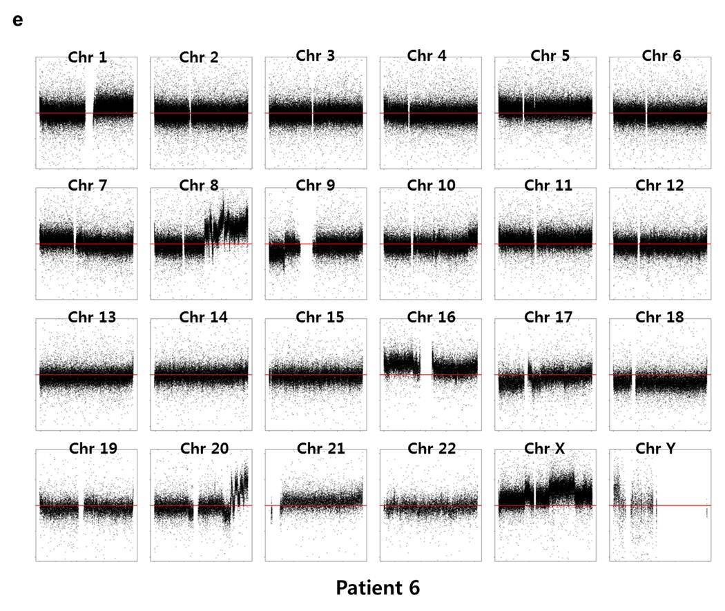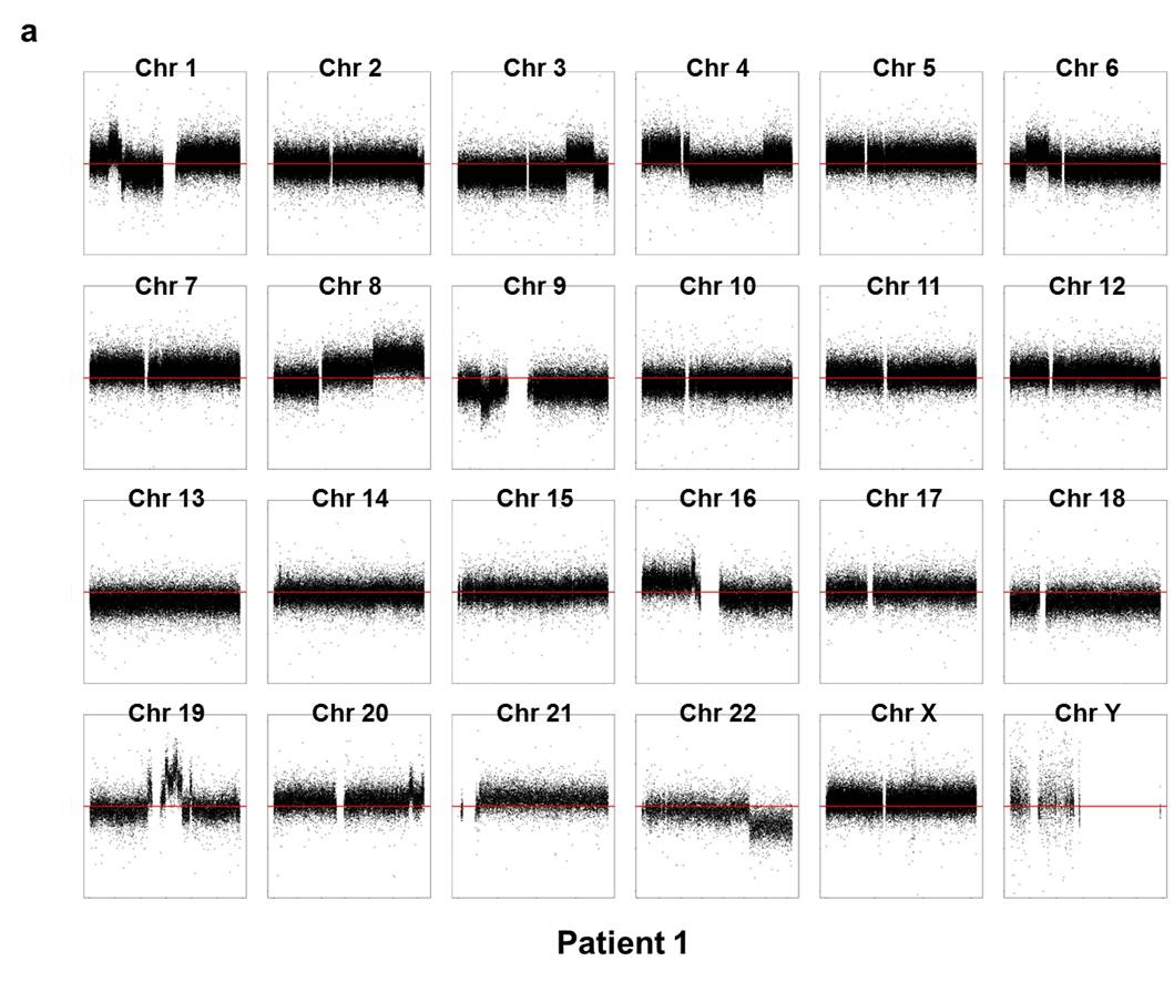 We used the circular binary segmentation method17 (CBS) for detecting statistically significant somatic copy number alterations. Copy number gain or loss beyond log2(tumor/normal) = ±0.3 (corresponding to the range outside 1.62~2.46 copies) was catalogued for each patient. Supplementary Fig. 8 shows the copy number altered regions in all six patients. We found multiple significant copy number gains in chromosomes 1, 5, 8, 16, 19, 20, X, and copy number losses in chromosomes 1, 6, 9, 16, 17, 18, 19, 22.