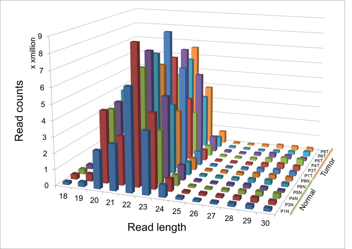 Supplementary Table 7 shows the statistics of read mapping for each patient data. On average, 70% and 76% of the total reads were mapped to the known microRNAs in normal and tumor tissues, respectively. Interestingly, the portion of mapped microRNAs was consistently higher by 5-6% in tumor samples. The length distribution of reads is shown in Supplementary Fig. 5. Reads in the range of 20-23 bp occupy 87.2% of the total reads, reflecting abundance of microRNAs among various groups of small RNAs. MicroRNA abundance was quantified by utilizing TMM normalization program11. The raw and normalized expression data were uploaded in GEO123.