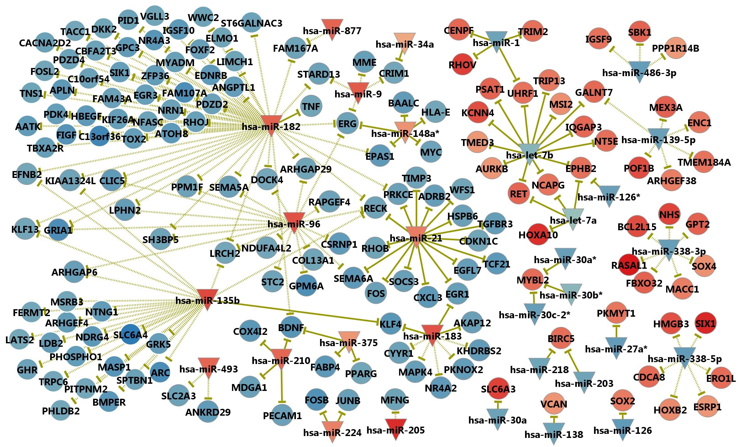To identify additional microRNAs that could be functionally important, we further investigated the anti-correlated expression between microRNAs and target genes. Targets were limited to the DEGs for this analysis. For DEmiR-DEG relations, we used both the validated and predicted microRNA-target relations. Validated target relations were obtained by merging the miRecords12 (version 3), miRTarBase13 (version 2.5), TarBase14 (version 5) and miRWalk15 (last update 11, 2011) databases that collected published results from the literature, and the predicted targets were obtained using TargetScan16 (version 6). With the Pearson correlation cutoff of -0.5, the P-value cutoff of 0.05, we identified 151 anti-correlated relations among (14 validated and 137 predicted). For exploring anti-correlated ‘non- DEmiR’-DEG relations, we used the validated targets only to reduce false positives. Using the same cutoffs and additional requirement of two fold change in microRNA expression, we obtained 53 anti-correlated relations. In total, we obtained 204 anti-correlated relations between 31 microRNAs and 165 DEGs (Supplementary Table 9). We also illustrated the anti- correlated relations in microRNA-centric network as shown in Supplementary Fig. 6.