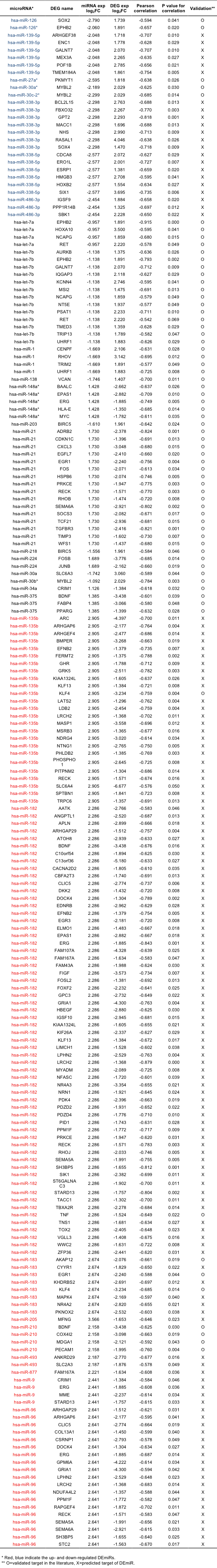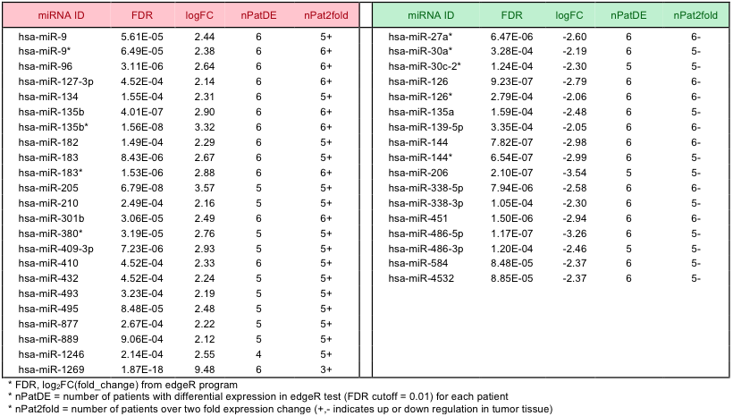 Differentially expressed microRNAs (DEmiRs) were determined by using a similar process described above for mRNA. Four conditions should be met to be selected as DEmiRs – (i) overall differential expression from the edgeR analysis with FDR < 0.001, (ii) minimum 3 patients with significant differential expression as tested by edgeR for individual differential expression with FDR < 0.01, (iii) consistent up/down regulation among different patients of over two fold change, and (iv) significant expression in at least 3 patients. For the last condition, we examined the distribution of normalized microRNA expression values in each patient and determined the upper 25 percentile as significantly expressed microRNA. Thus, the larger of the expression values in either tumor or normal tissues should be within upper 25% in at least 3 patients to be eligible as a DEmiR. We found 40 DEmiRs (23 up- regulated and 17 down-regulated microRNAs in cancer) satisfying these conditions (Supplementary Table 8).